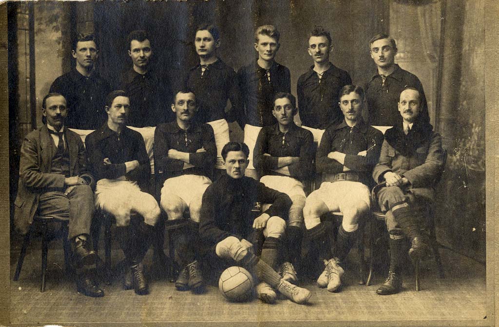 Erringung der Süddeutschen Meisterschaft der B-Klasse durch die Mannschaft des Beiertheimer Fußballvereins 1898: Bau, Frank, Godelmann, Greber, Karcher, Kugelstadt, Lindauer, Reiser, Reubelt, Schill, Artur Schmuck, Wilhelm Schmuck. Damit erfolgt der Aufstieg in die A-Klasse