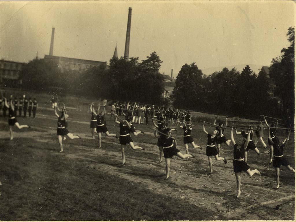 Einweihung des neuen Sportplatzes und des Vereinsheims der Turnerschaft 1884 Karlsruhe-Beiertheim e.V. beim Stephanienbad mit Schauturnen. Genutzt wird auch die Turnhalle der Südendschule